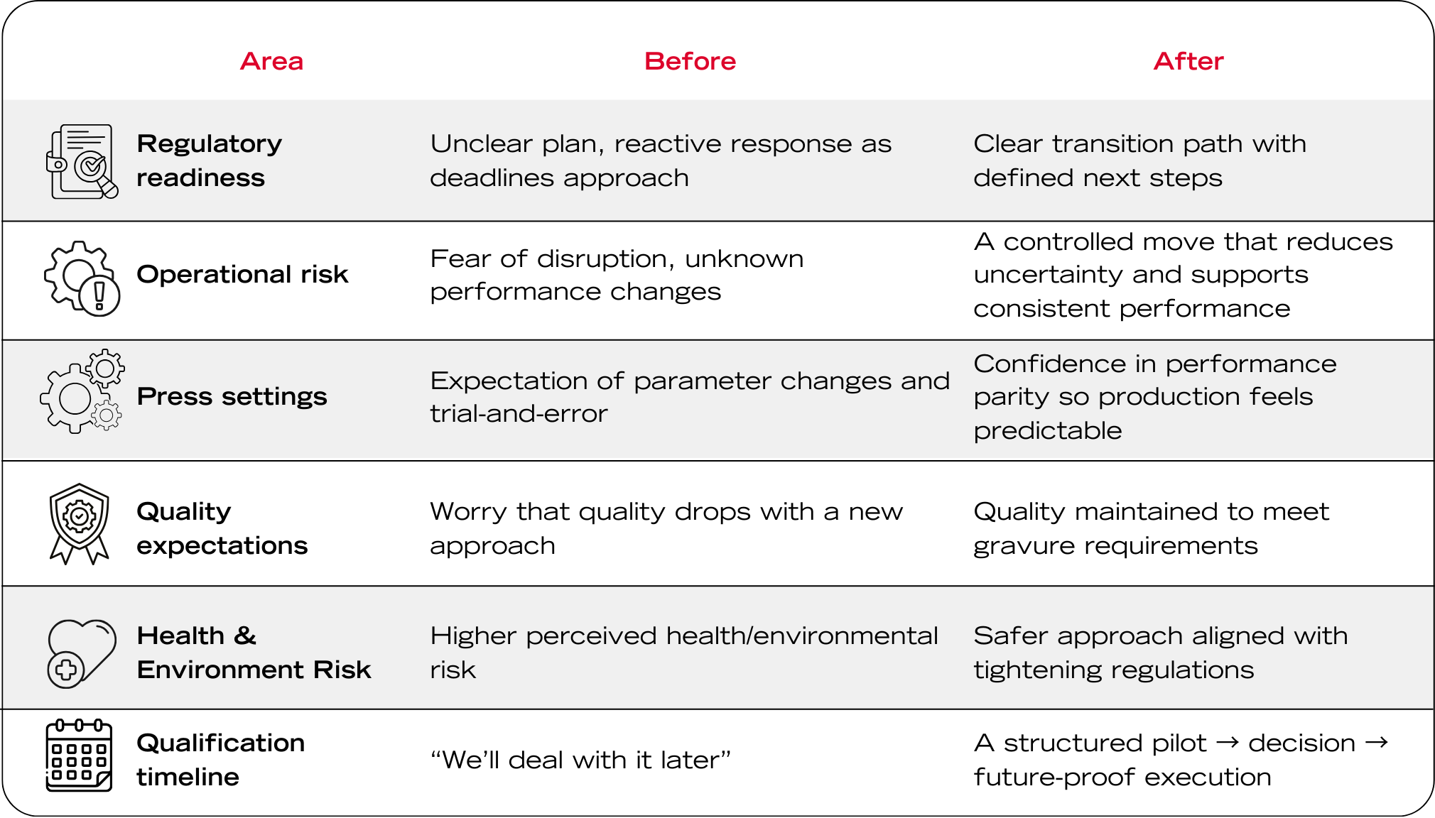 A safer alternative only matters if it works in real production. The goal is simple: stay compliant and keep output predictable. This table breaks down what typically improves when we help you take a qualification-first approach.